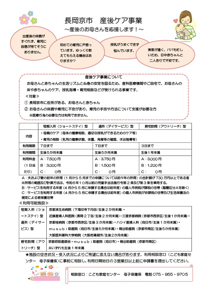 産後のお母さんを応援します! 産後ケア事業 交流・子育て相談 2025.11.26 「出産後の体調がすぐれず、育児に自信が持てそうにありません」「初めての育児に戸惑っています」「授乳がうまくできず悩んでいます」「実家が遠く、パパも忙しいため、日中赤ちゃんと二人きりで不安です」…など、産後のお母さんには不安と悩みがいっぱい。 産後ケア事業とは、お母さんと赤ちゃんの生活リズムと心身の安定を図るため、産科医療機関やご自宅で、お母さんの体や赤ちゃんのケア、授乳指導・育児相談などが受けられる事業です。 詳しくは添付のチラシをご覧ください。 PDFダウンロード PDFダウンロード